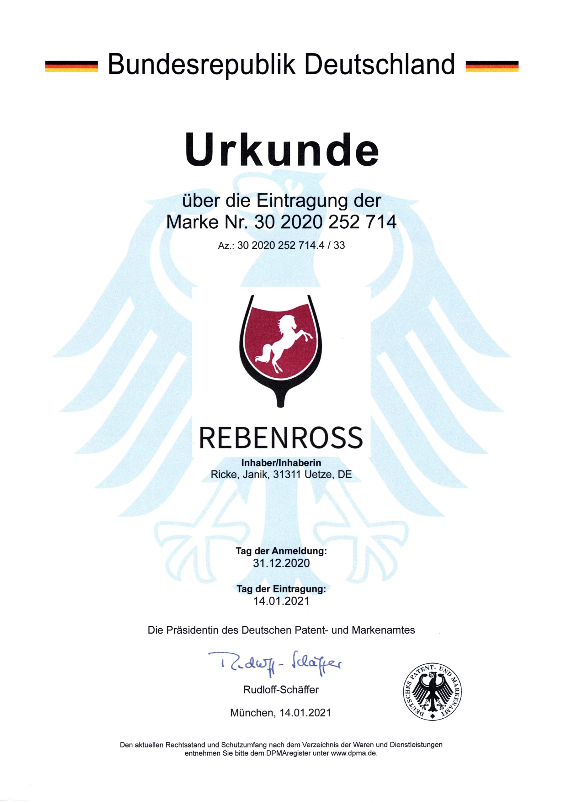 Rebenross is a word and figurative mark registered at the German Patent and Trade Mark Office under registration number 302020252714 in trade mark classes 21,33 and 41. Class 21 includes appliances and containers for household and accessories. Class 33 includes alcoholic beverages (excluding beers). Class 41 covers educational, training and entertainment events as well as sporting and cultural activities. This broad protection ensures that our name may not be used by third parties. This creates an unmistakable recognition value for the customer.